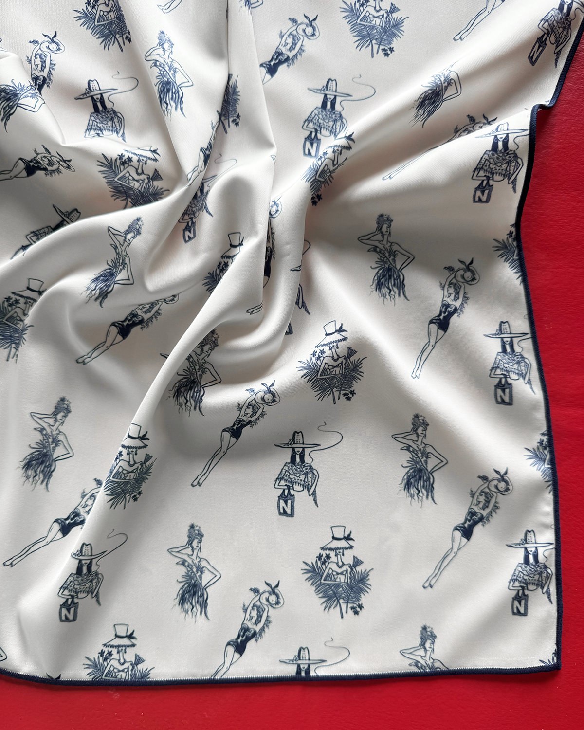 A silk canvas for escape, this scarf is illustrated with hand-drawn muses—chic women at leisure, inspired by vintage fashion sketches and a wink of pin-up charm. Its pattern recalls the spirit of Capri, Marrakech, and Saint Barths—where glamour meets adventure. Tuck into a breast pocket Tuck it into a pocket, tie it at the neck or wrist, or fasten it to a bag -- a versatile accent that turns any moment into a holiday.
