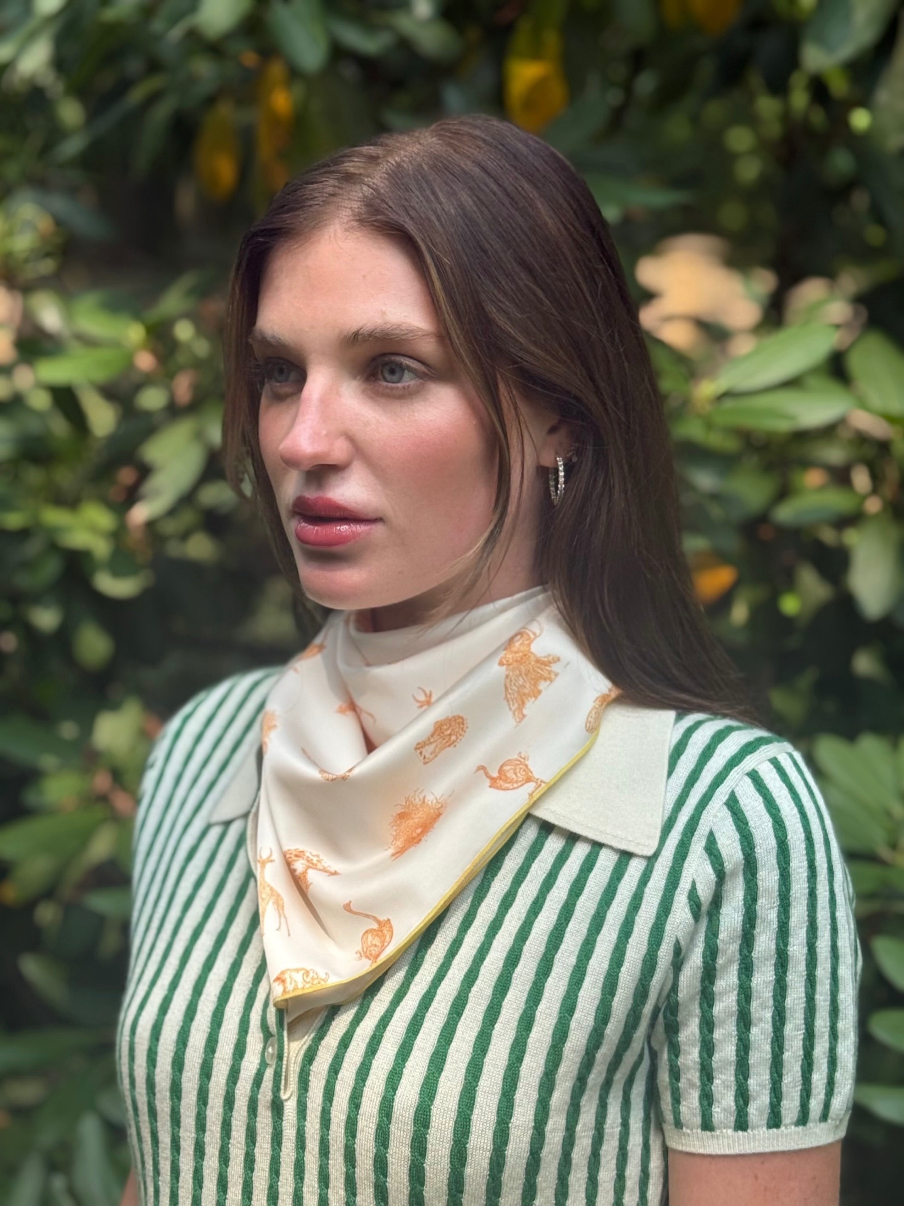 Inspired by folklore, fables, and a wink of absurdity, this silk scarf is patterned with hand-drawn beings—part myth, part mischief. Flowing and versatile, it can be tied at the neck, worn in the hair, or knotted onto a bag—bringing a touch of artful fantasy wherever it goes.